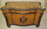 Modern Rococo style console by Casa Bique, lion head center emblem, double door, one drawer, faux marble top, not removable, has some small scratches, 36"h., 48"w., 20"d. Modern Rococo style console by Casa Bique, lion head center emblem, double door, one drawer, faux marble top, not removable, has some small scratches, 36"h., 48"w., 20"d.