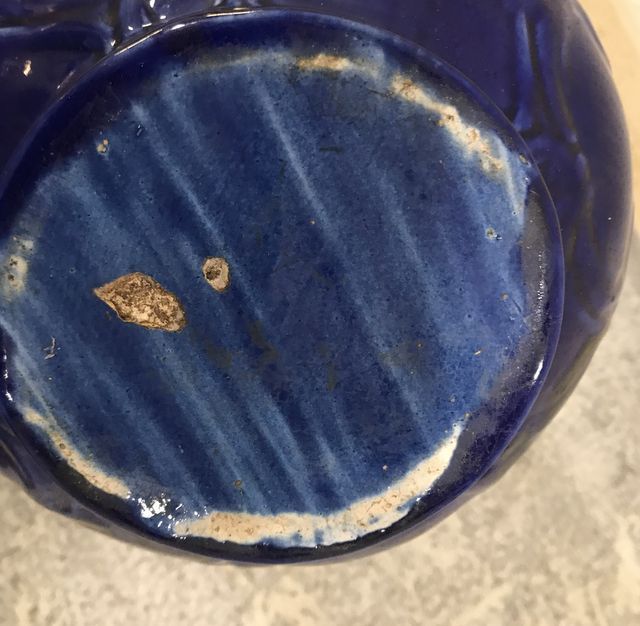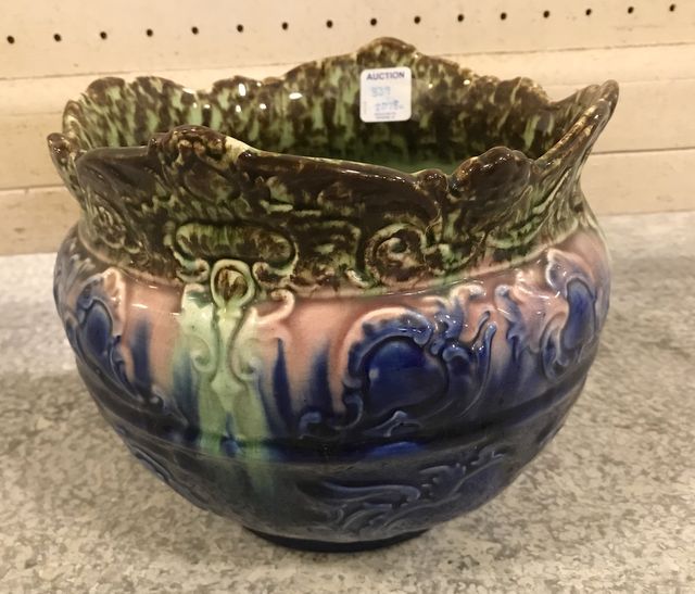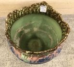 Majolica style glazed colorful pottery bowl, has chip on very bottom, 7"h., 8"dia. Majolica style glazed colorful pottery bowl, has chip on very bottom, 7"h., 8"dia.