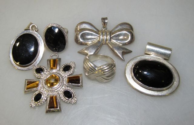 Mexico .925 ring, .925 bowtie pendent, two .925 pendents and ring, Judith Ripka .925 pendant with stones, Mexico .925 ring, .925 bowtie pendent, two .925 pendents and ring, Judith Ripka .925 pendant with stones,