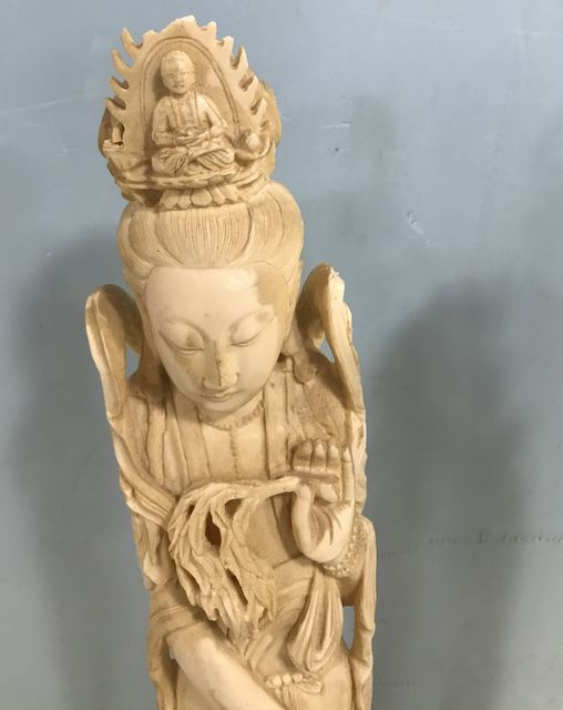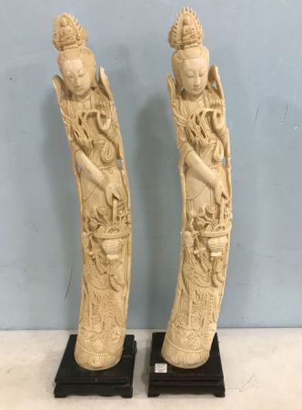 Pair of Asian woman carved or formed out of alabaster tusk replica, one has chip on crown, wood stands, 30"h. Pair of Asian woman carved or formed out of alabaster tusk replica, one has chip on crown, wood stands, 30"h.