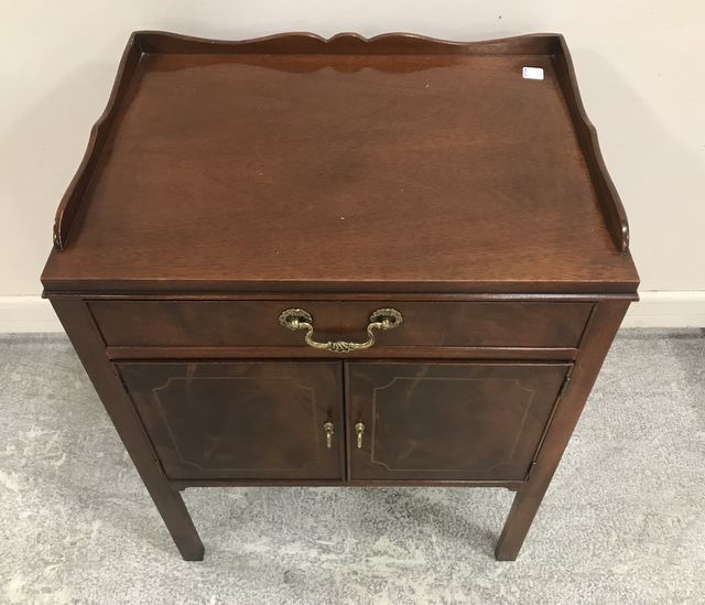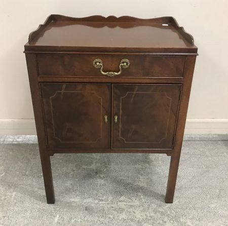 Baker furniture company, mahogany double door commode, single top drawer, top gallery, 28"h. 22"w., 16"d. Baker furniture company, mahogany double door commode, single top drawer, top gallery, 28"h. 22"w., 16"d.
