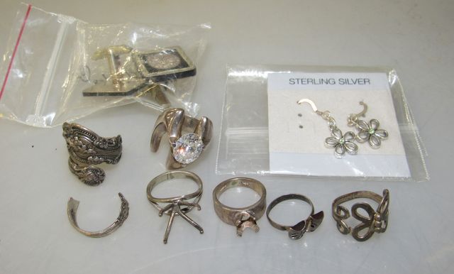 Sterling flatware handle ring, .925 ring with clear stone, 2 sterling settings, two sterling rings, .925 Aztec cuff links, pair of sterling flower earrings. Sterling flatware handle ring, .925 ring with clear stone, 2 sterling settings, two sterling rings, .925 Aztec cuff links, pair of sterling flower earrings.