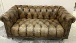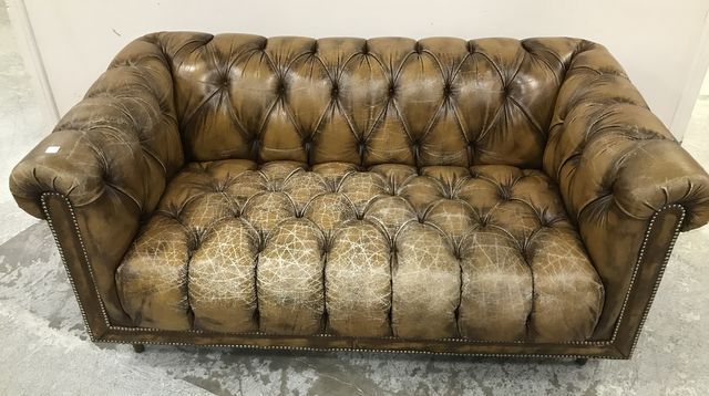 Modern Chesterfield style sofa, vinyl, button tufted, finish is worn, has back wheels, 28"h., 61"w. Modern Chesterfield style sofa, vinyl, button tufted, finish is worn, has back wheels, 28"h., 61"w.