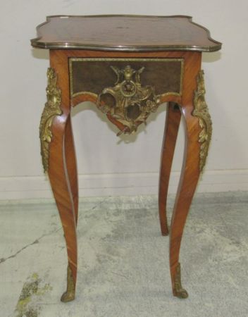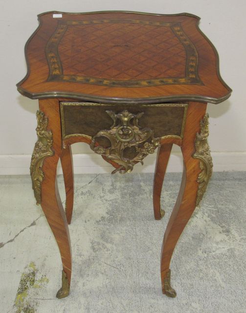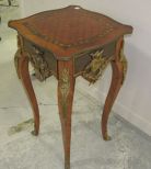 Vintage French Parquet top with brass ormolu ornate decor, one drawer, couple of small wood pieces missing on top and sides, 33"h., 19"dia. Vintage French Parquet top with brass ormolu ornate decor, one drawer, couple of small wood pieces missing on top and sides, 33"h., 19"dia.