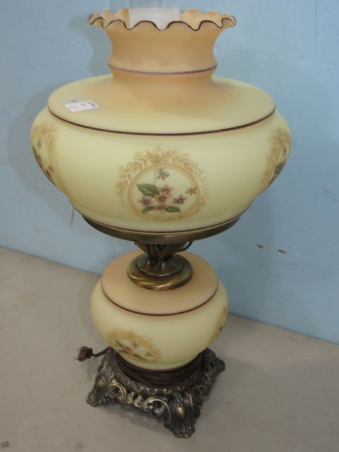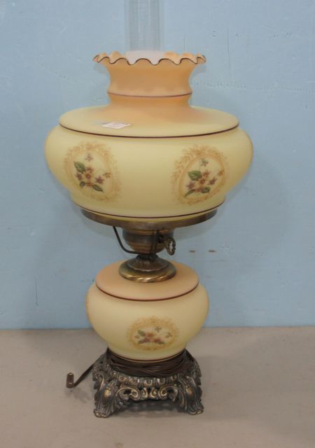 Vintage glass globe lamp with floral designs, hurricane shade, ornate metal base, good condition, 22"h. Vintage glass globe lamp with floral designs, hurricane shade, ornate metal base, good condition, 22"h.