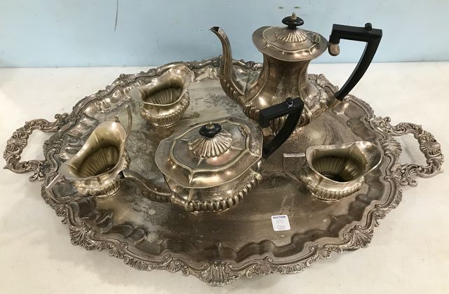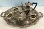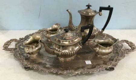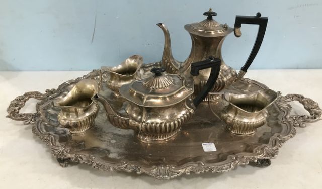 Sheffield England, Electroplated nickel silver or EPNS tea set, Coffee pitcher, sugar, creamer, water pitcher, ornate footed silver plate tray 29"w, pieces has tarnish. Sheffield England, Electroplated nickel silver or EPNS tea set, Coffee pitcher, sugar, creamer, water pitcher, ornate footed silver plate tray 29"w, pieces has tarnish.