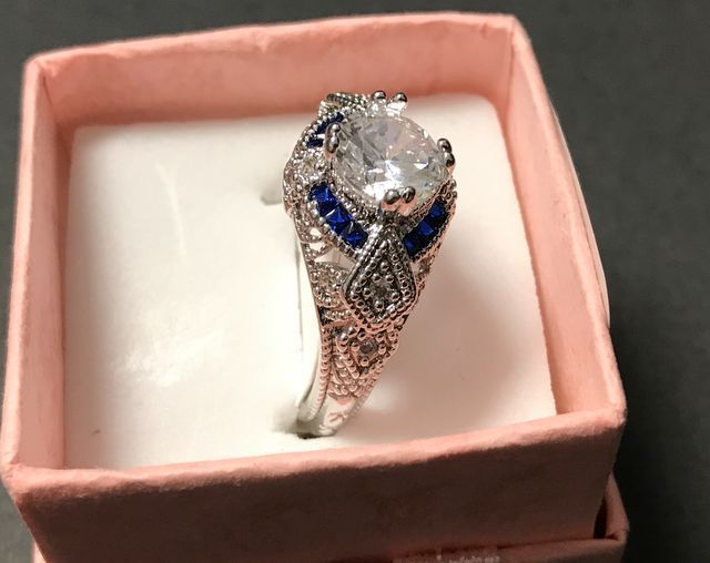 Clear stone cocktail ring surrounding blue stone, size 8. Clear stone cocktail ring surrounding blue stone, size 8.