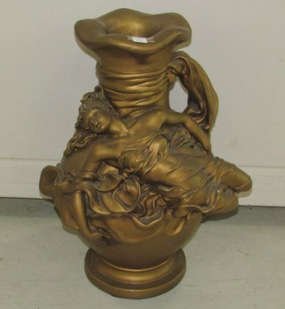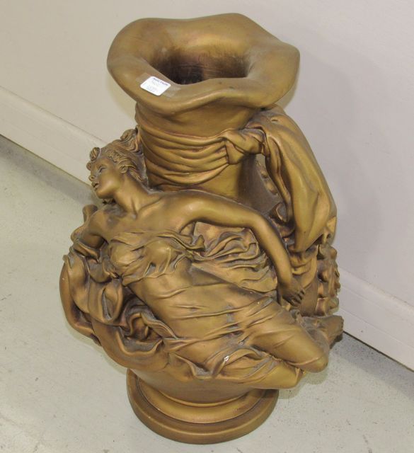 Vintage plaster pottery vase and lady figure, gold antiqued color, 23"h. Vintage plaster pottery vase and lady figure, gold antiqued color, 23"h.