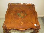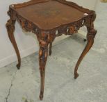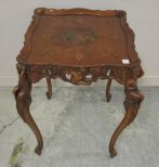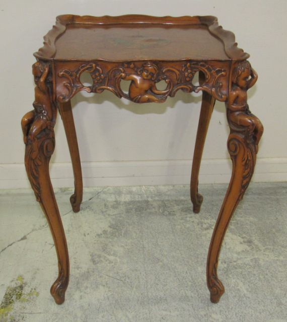 John M. Smyth Co., ornate carved border with children figures on legs and sides, inlaid veneer top with flower emblem, has a bubble in center of top, 28"h., 19"sq. John M. Smyth Co., ornate carved border with children figures on legs and sides, inlaid veneer top with flower emblem, has a bubble in center of top, 28"h., 19"sq.