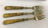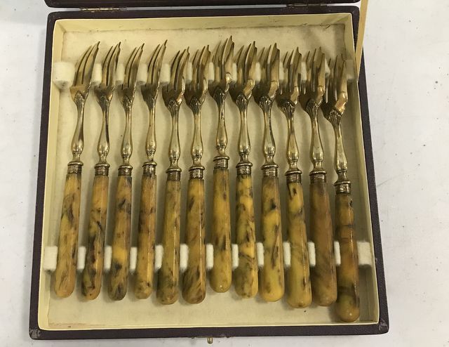 12 French art deco oyster forks, gilt brass and celluloid plastic ( few have hairline cracks) in case. Bluebird European Antiques. 12 French art deco oyster forks, gilt brass and celluloid plastic ( few have hairline cracks) in case. Bluebird European Antiques.