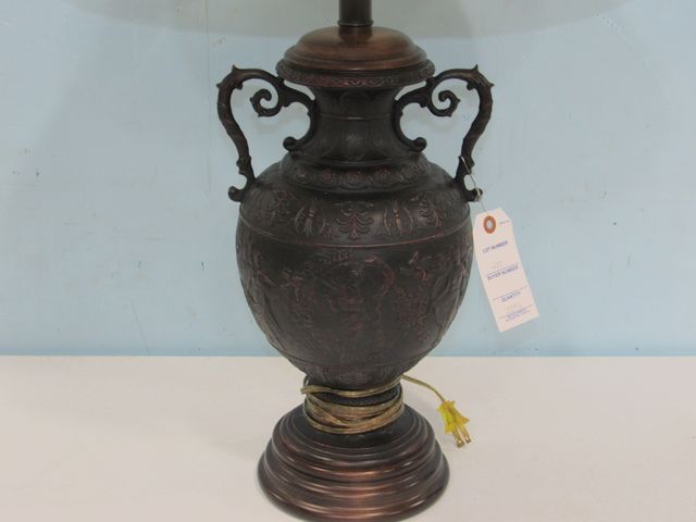 Modern decor, antiqued style metal urn table lamp, Grecian artwork, wood base, 31"h. Modern decor, antiqued style metal urn table lamp, Grecian artwork, wood base, 31"h.