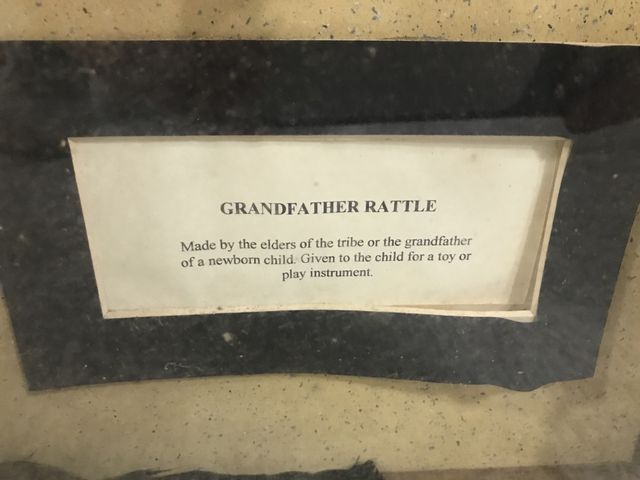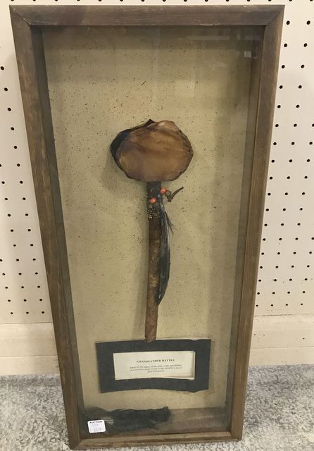 Replica grandfather rattle shadow box framed, made by elders in tribe or grandfather of newborn child, 25"h., 11"w. Replica grandfather rattle shadow box framed, made by elders in tribe or grandfather of newborn child, 25"h., 11"w.