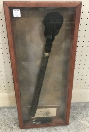 Replica buffalo rattle, used in ceremonial dances, shadow box framed, 25"h., 11"w. Replica buffalo rattle, used in ceremonial dances, shadow box framed, 25"h., 11"w.