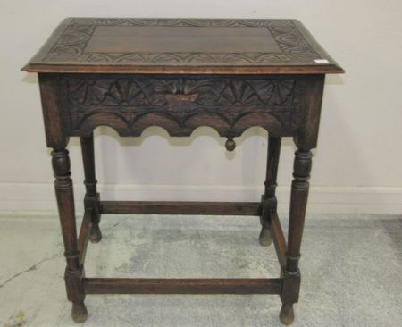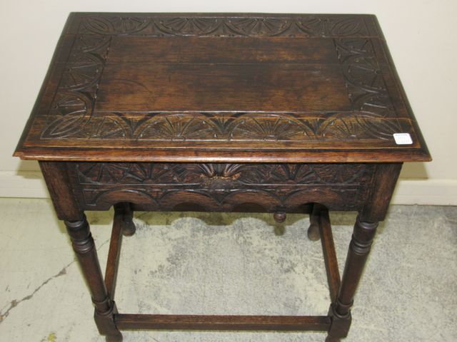 English carved side table, carved designs on top, with figural (is broke off and missing) carved drawer pull, two tier, has light areas, 29"h., 26"w., 17"d. English carved side table, carved designs on top, with figural (is broke off and missing) carved drawer pull, two tier, has light areas, 29"h., 26"w., 17"d.