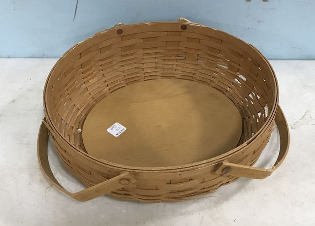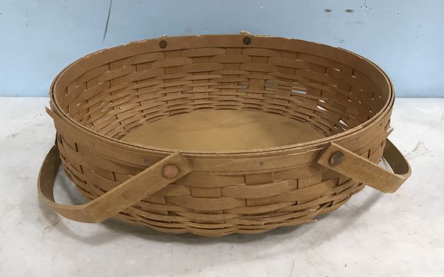 Hand crafted Longaberger handled basket, has splits in oak bands, 14"dia. Hand crafted Longaberger handled basket, has splits in oak bands, 14"dia.