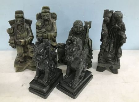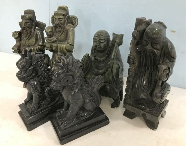 Set of Spinach jadeite carved Asian figures, set of black jadeite Foo Dogs 7"h. Set of Spinach jadeite carved Asian figures, set of black jadeite Foo Dogs 7"h.