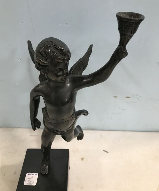 Metal bronzed color John Richard collection cupid with torch, needs tightening to base. 15"h. Metal bronzed color John Richard collection cupid with torch, needs tightening to base. 15"h.