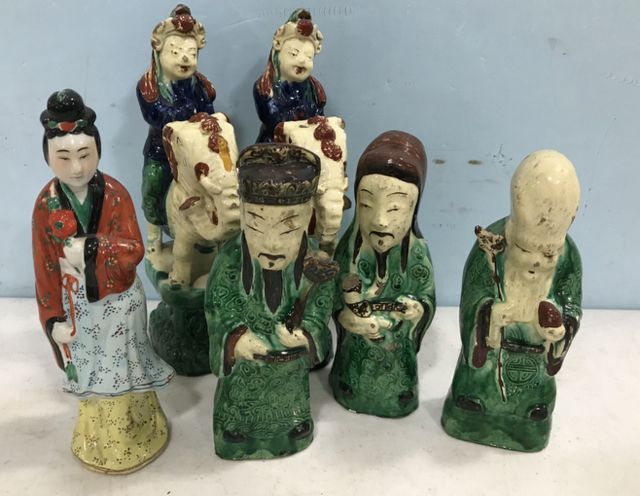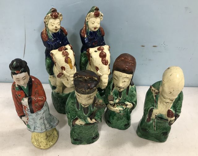 Six total pieces of pottery decor figures, hand painted, modern reproductions, Asian style artwork, tallest is 11"h. Six total pieces of pottery decor figures, hand painted, modern reproductions, Asian style artwork, tallest is 11"h.
