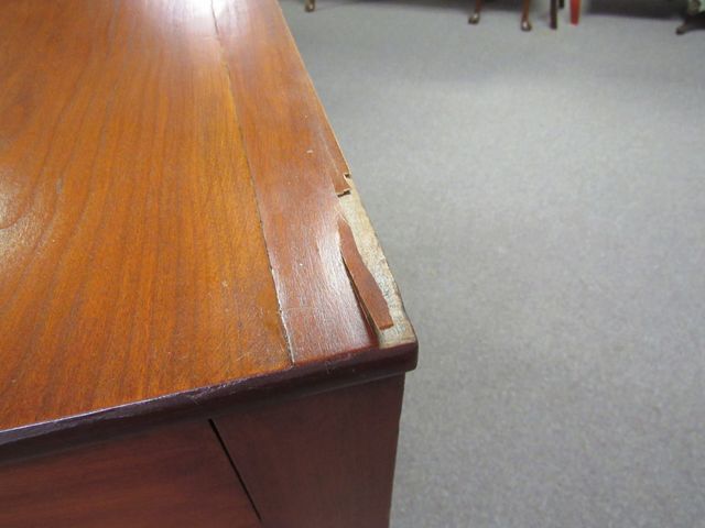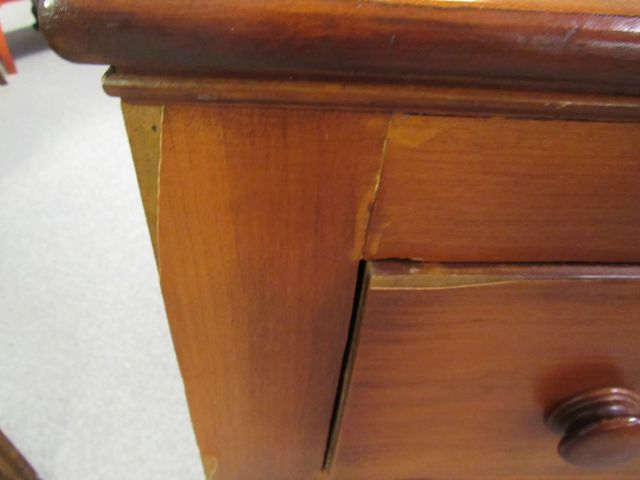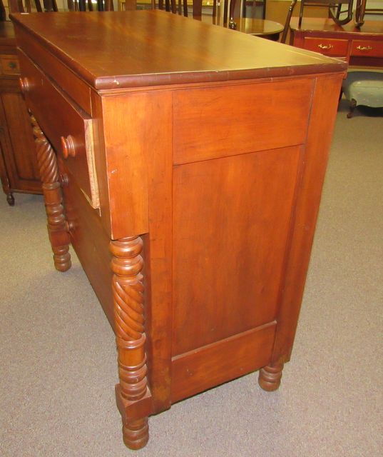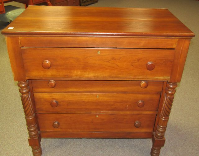 American Empire chest of drawers, four drawers with key hole (no key), twist style columns, has loose veneer and missing pieces, 44"h., 43"w., 23"d. American Empire chest of drawers, four drawers with key hole (no key), twist style columns, has loose veneer and missing pieces, 44"h., 43"w., 23"d.