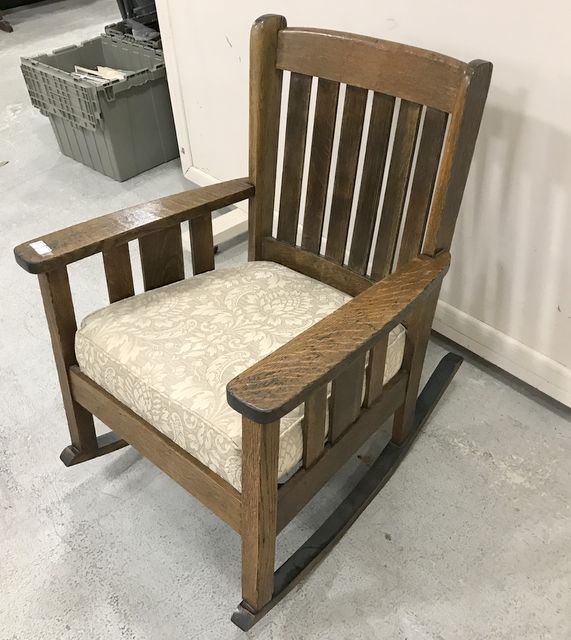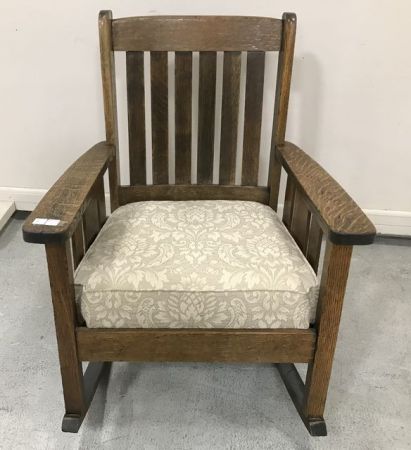 Vintage oak mission style rocker with removable seat, has slight split on back top frame, 35"h. Vintage oak mission style rocker with removable seat, has slight split on back top frame, 35"h.