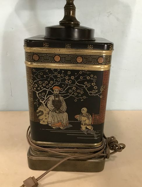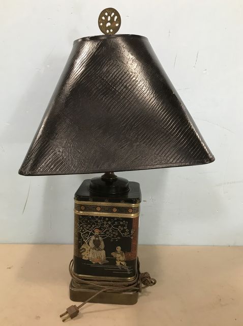 Modern decor black Asian style tin lamp, 26"h. Modern decor black Asian style tin lamp, 26"h.