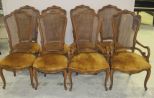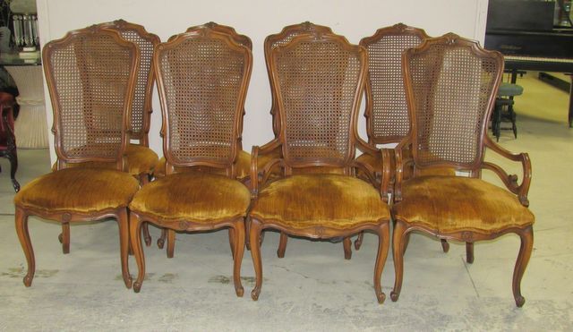 Eight country french cane back dining chairs, two arms, six sides, upholstered seats, several chairs needs to be tightened, one has small hole in cane, 44 1/2"h. Eight country french cane back dining chairs, two arms, six sides, upholstered seats, several chairs needs to be tightened, one has small hole in cane, 44 1/2"h.