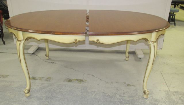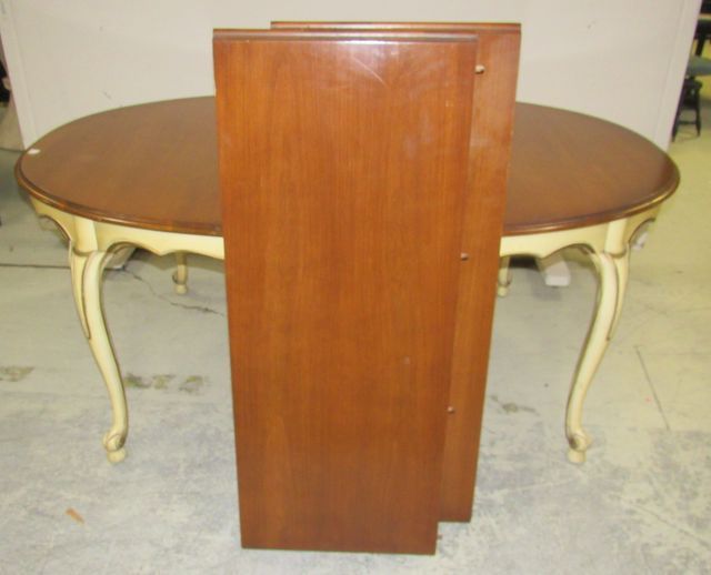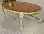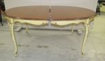 Oval dining table, painted base with trim work, two leaves. Oval dining table, painted base with trim work, two leaves.