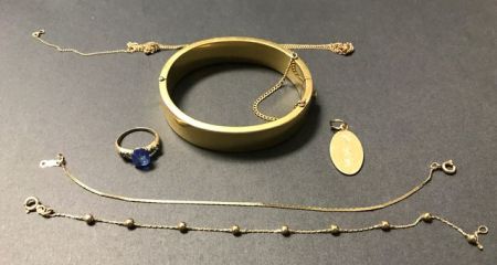 12 Kt. gold filled bracket, 10 kt. ring with sapphire stone, 12 kt. monogrammed pendant, 14 kt. gold filled bracket, 14kt. gold filled bead bracket, 10 kt gold filled necklaces. 12 Kt. gold filled bracket, 10 kt. ring with sapphire stone, 12 kt. monogrammed pendant, 14 kt. gold filled bracket, 14kt. gold filled bead bracket, 10 kt gold filled necklaces.