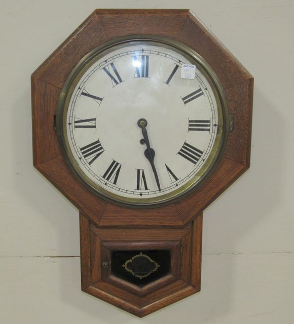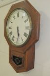 Oak polygon wall clock, glass front door with glass bottom door, is working but doesn't have pendulum, has pendulum rod and key, 25"h., 17"w. Oak polygon wall clock, glass front door with glass bottom door, is working but doesn't have pendulum, has pendulum rod and key, 25"h., 17"w.
