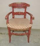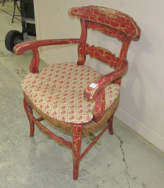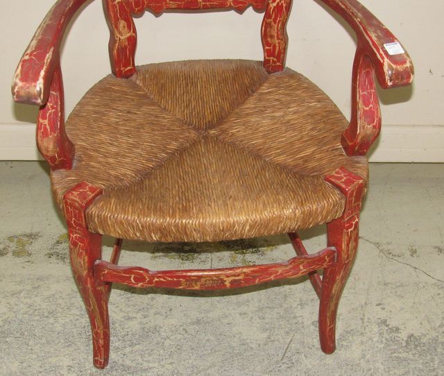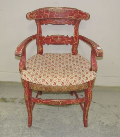 Red painted age crackle design arm chair with woven seat, comes with cushion, 33"h. Red painted age crackle design arm chair with woven seat, comes with cushion, 33"h.