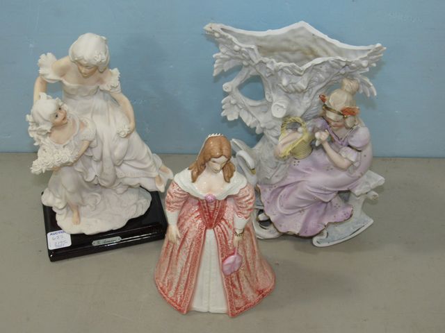 Ceramic hand painted lady planter signed and mode number, 10"h. G.Armani "Florence" woman and child figurine 10"h. Goebel Christina lady figurine 9"h. Ceramic hand painted lady planter signed and mode number, 10"h. G.Armani "Florence" woman and child figurine 10"h. Goebel Christina lady figurine 9"h.