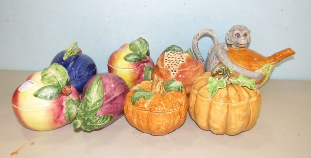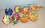 Assorted variety of hand painted ceramic fruit containers, 8 total pieces. Assorted variety of hand painted ceramic fruit containers, 8 total pieces.