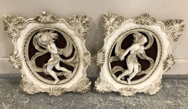 Vintage ornate lady figures, wall decor plaques, one has damaged on felt back ground, 21"h., 13"w. Vintage ornate lady figures, wall decor plaques, one has damaged on felt back ground, 21"h., 13"w.