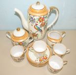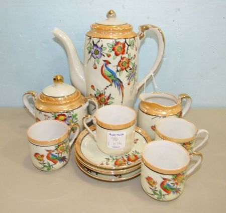 Japan, pot with lid, four cups, four saucers, creamer, sugar, chip on spout on tea pot. Japan, pot with lid, four cups, four saucers, creamer, sugar, chip on spout on tea pot.