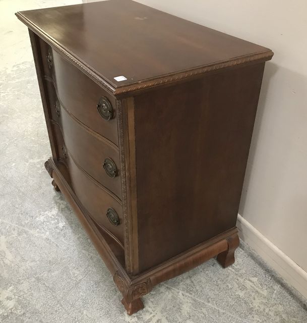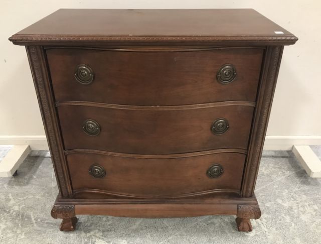 Pulaski bash cherry bow front chest, modern decor, claw foot, has worn spots on piece, 36"h., 36"w., 20"d. Pulaski bash cherry bow front chest, modern decor, claw foot, has worn spots on piece, 36"h., 36"w., 20"d.