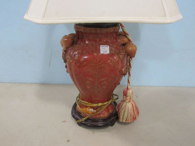 Rust modern oriental stye urn table lamp with wood base, 30"h. Rust modern oriental stye urn table lamp with wood base, 30"h.