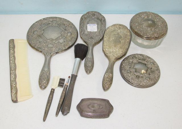 Silver plate hand mirror, two brushes, powder container, comb, brush. Silver plate hand mirror, two brushes, powder container, comb, brush.
