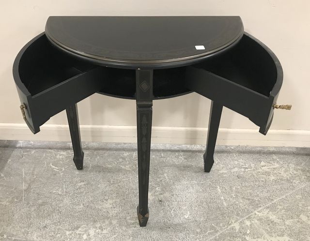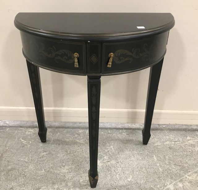 Modern demi lune console table, two drawers, modern decor, has some chips on finish, 30"h., 28"w., 14"d. Modern demi lune console table, two drawers, modern decor, has some chips on finish, 30"h., 28"w., 14"d.