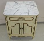 Painted end table with rose carved decor and pull, double door, Italian marble, 24"h., 20"w., 15"d. Painted end table with rose carved decor and pull, double door, Italian marble, 24"h., 20"w., 15"d.