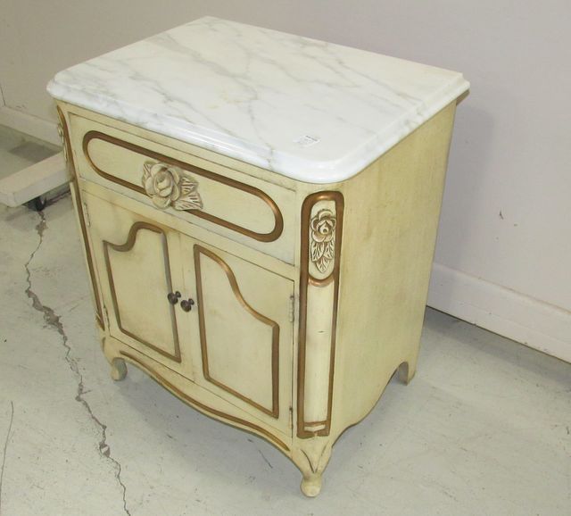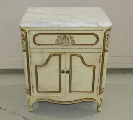 Painted end table with rose carved decor and pull, double door, Italian marble, 24"h., 20"w., 15"d. Painted end table with rose carved decor and pull, double door, Italian marble, 24"h., 20"w., 15"d.