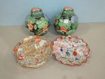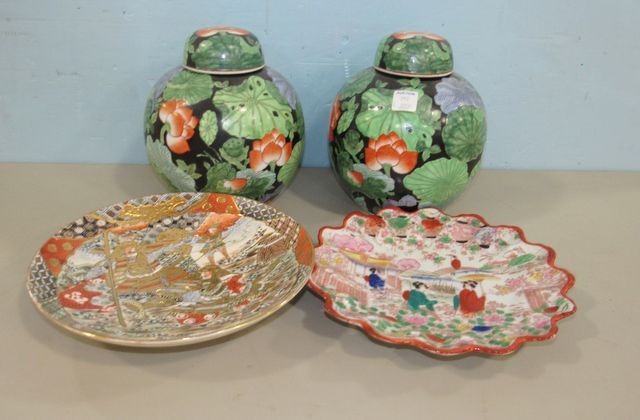 Pair of Modern hand painted porcelain ginger jars 8"h., Japanese hand painted with Geisha scenery plate 10"dia., Satsuma style hand painted plate with warrior scenery, gold embossed, 10"dia. Pair of Modern hand painted porcelain ginger jars 8"h., Japanese hand painted with Geisha scenery plate 10"dia., Satsuma style hand painted plate with warrior scenery, gold embossed, 10"dia.
