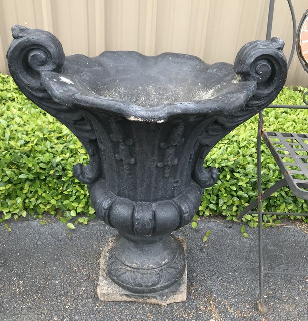Rustic concrete urn, has some chips, heavy, 24"h.,23"w. Rustic concrete urn, has some chips, heavy, 24"h.,23"w.