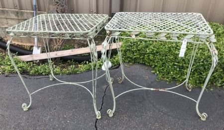 Weather aged, two iron stands, 26"h., 24"w., 17"d. Weather aged, two iron stands, 26"h., 24"w., 17"d.