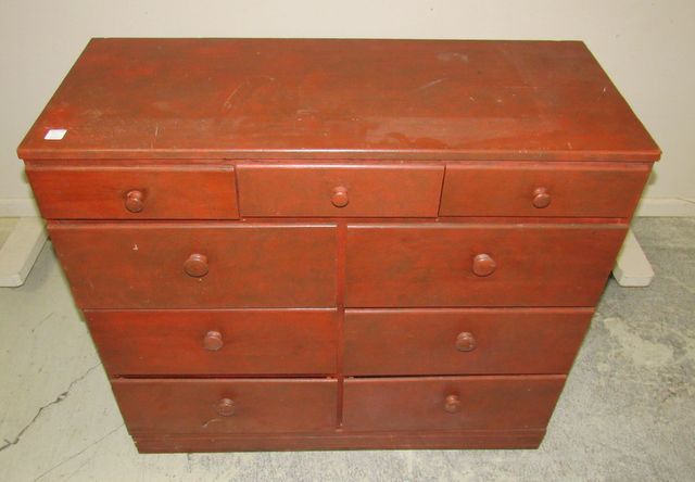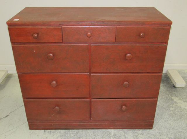 Thin wood chest with red color finish, nine drawers, 32"h., 36"w., 15"d. Thin wood chest with red color finish, nine drawers, 32"h., 36"w., 15"d.