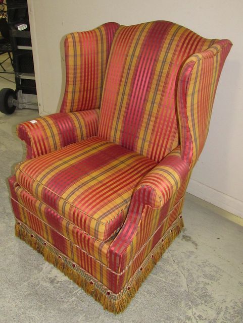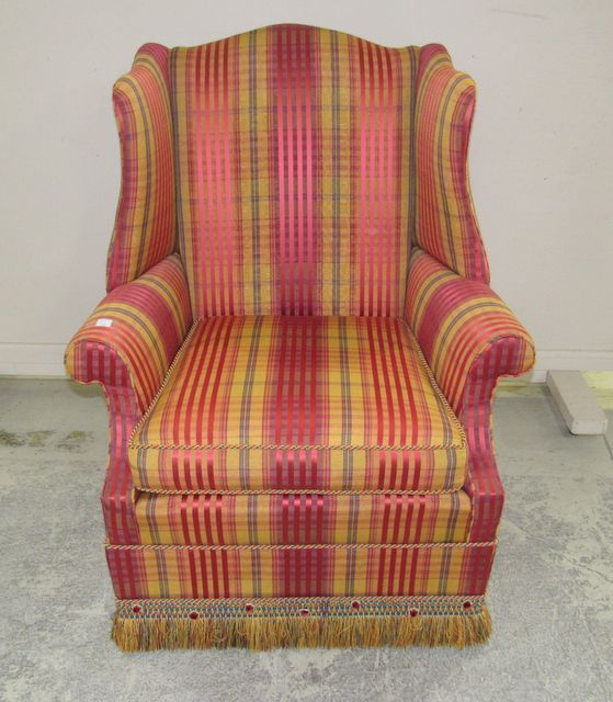 Striped upholstered wing back arm chair with skirt, good condition, 41"h. Striped upholstered wing back arm chair with skirt, good condition, 41"h.