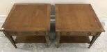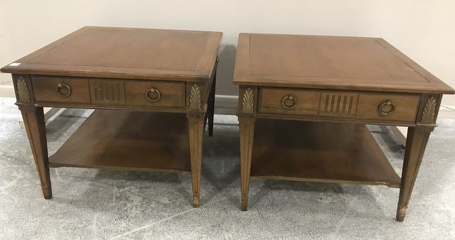 Pair of 1980-90s mid century lamp tables, two tier, single drawers, has wood finish wear, 20"h., 25"sq. Pair of 1980-90s mid century lamp tables, two tier, single drawers, has wood finish wear, 20"h., 25"sq.