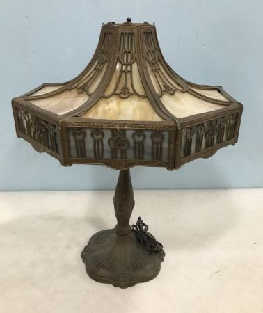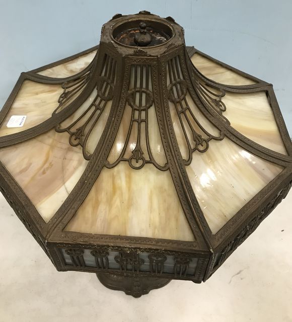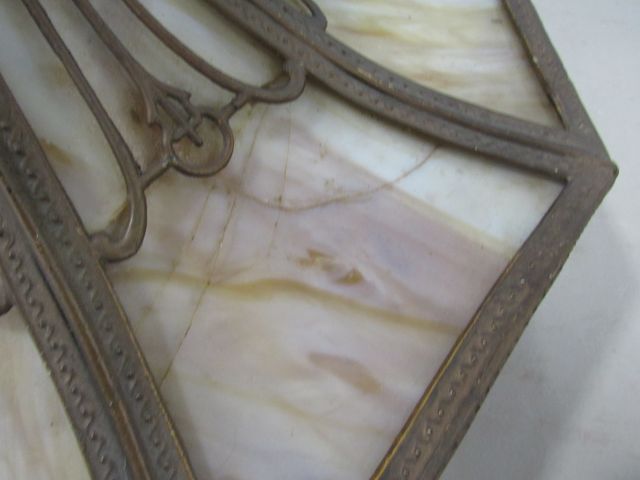 Ornate metal frame work with colorful slag glass panels, one has repaired crack, has vintage base. 20"w. Ornate metal frame work with colorful slag glass panels, one has repaired crack, has vintage base. 20"w.
