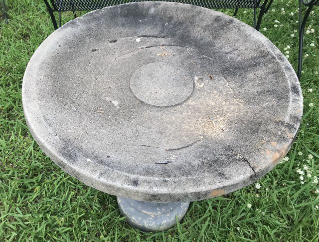 Concrete round top pedestal bird bath, two piece, 27"dia., 26"h. Concrete round top pedestal bird bath, two piece, 27"dia., 26"h.