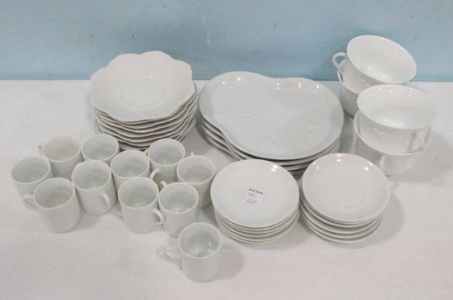 Four Phillippe Deshoulieres limoge luncheon plates and cups, white porcelain cups and saucers. Four Phillippe Deshoulieres limoge luncheon plates and cups, white porcelain cups and saucers.