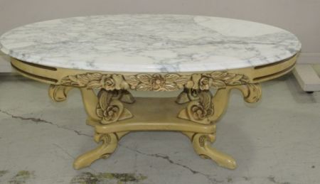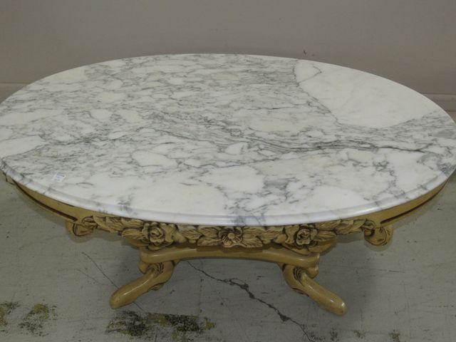 Rose carved painted Italian marble coffee table, missing one leg, 19"h., 45"w., 28"d. Rose carved painted Italian marble coffee table, missing one leg, 19"h., 45"w., 28"d.